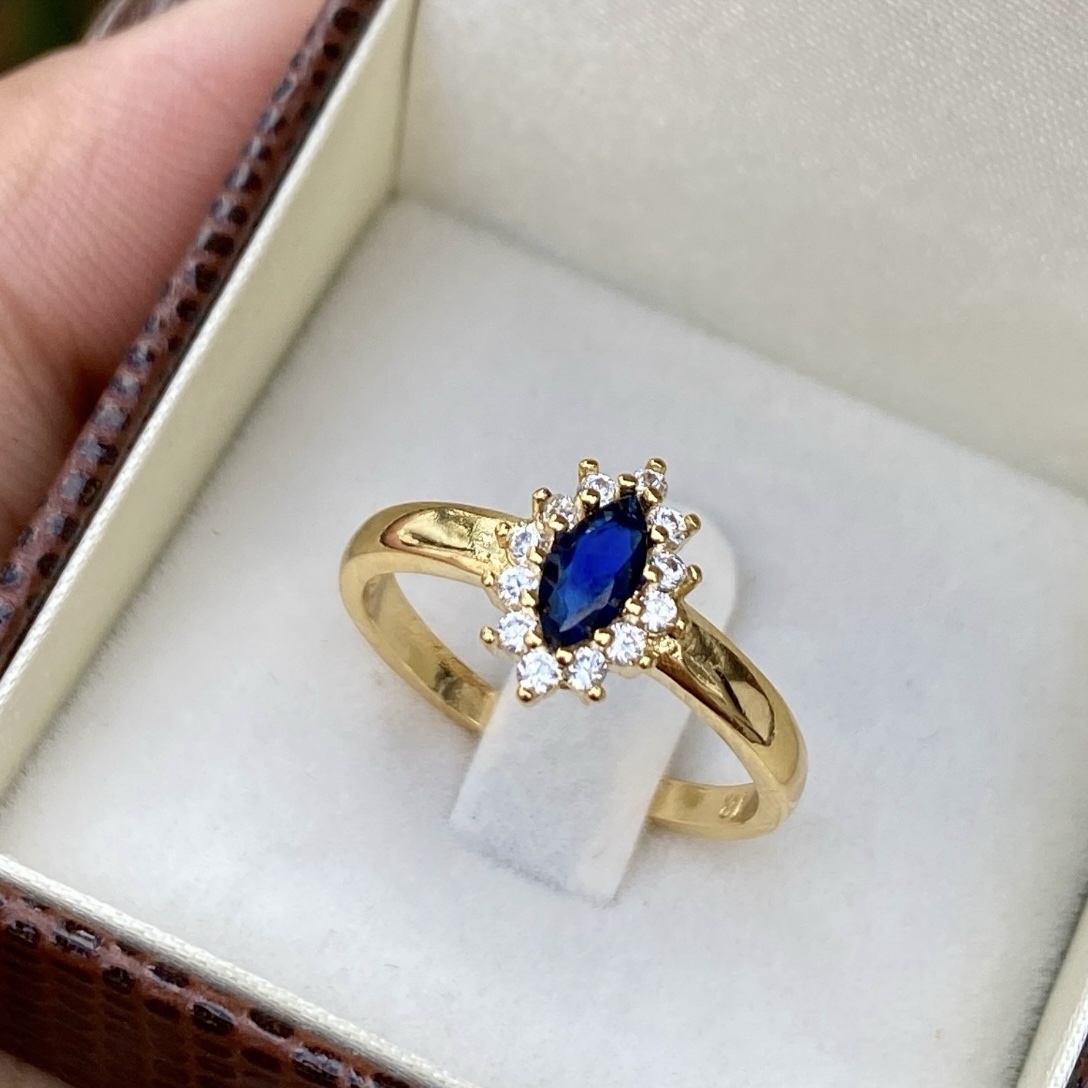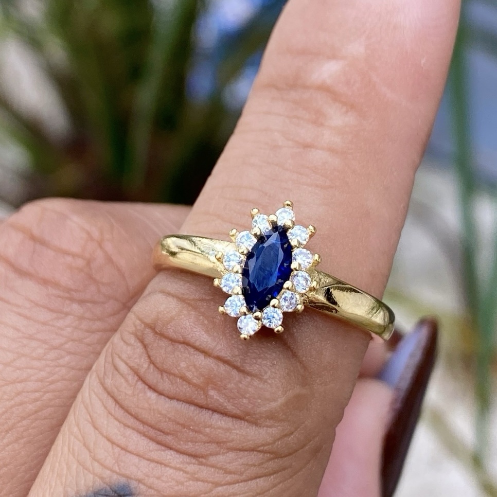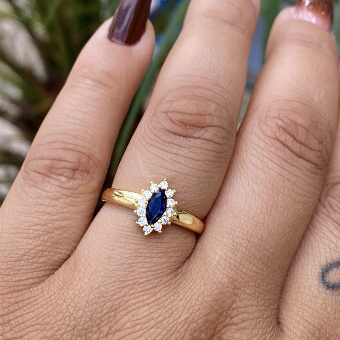 Anel Solitário Antonella Noivado Banhado a Ouro 18k Pedra Azul Marinho
