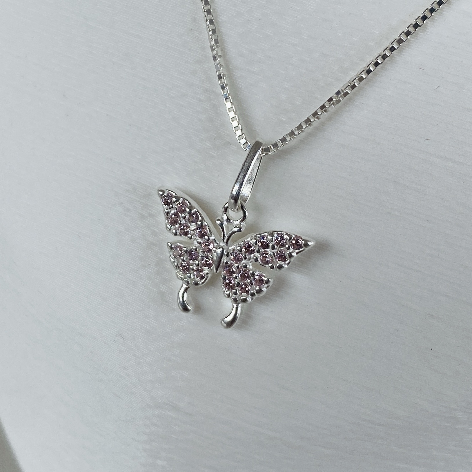 Corrente Feminina Com Pingente Borboleta Cravejada Pedrinha Rosa